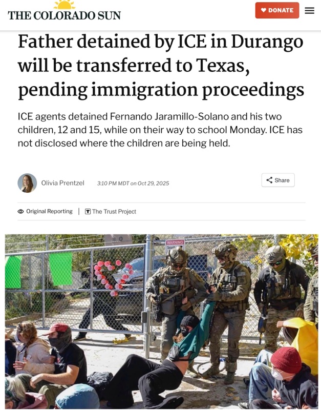 In Durango, masked ICE agents swooped in and arrested an asylum seeking 45 year old (with no prior criminal record) as he was escorting his two children to school. Ages 12 and 15. All were handcuffed. This caused a major disturbance when locals tried to stop the Gestapo wannabes from removing all innocent victims to Texas. Which ICE eventually did after roughing up many Durango citizens. ICE later admitted the arrests were a case of “mistaken identity.” Yet all three are still in custody in the Lone Star state. Shameful.