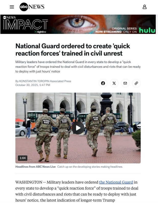 F) The questionable use of the National Guard in cities (mostly Blue) to supposedly quell crime. Lest we forget, the National Guards have been ordered to “create quick reaction forces” trained in civil unrest.”